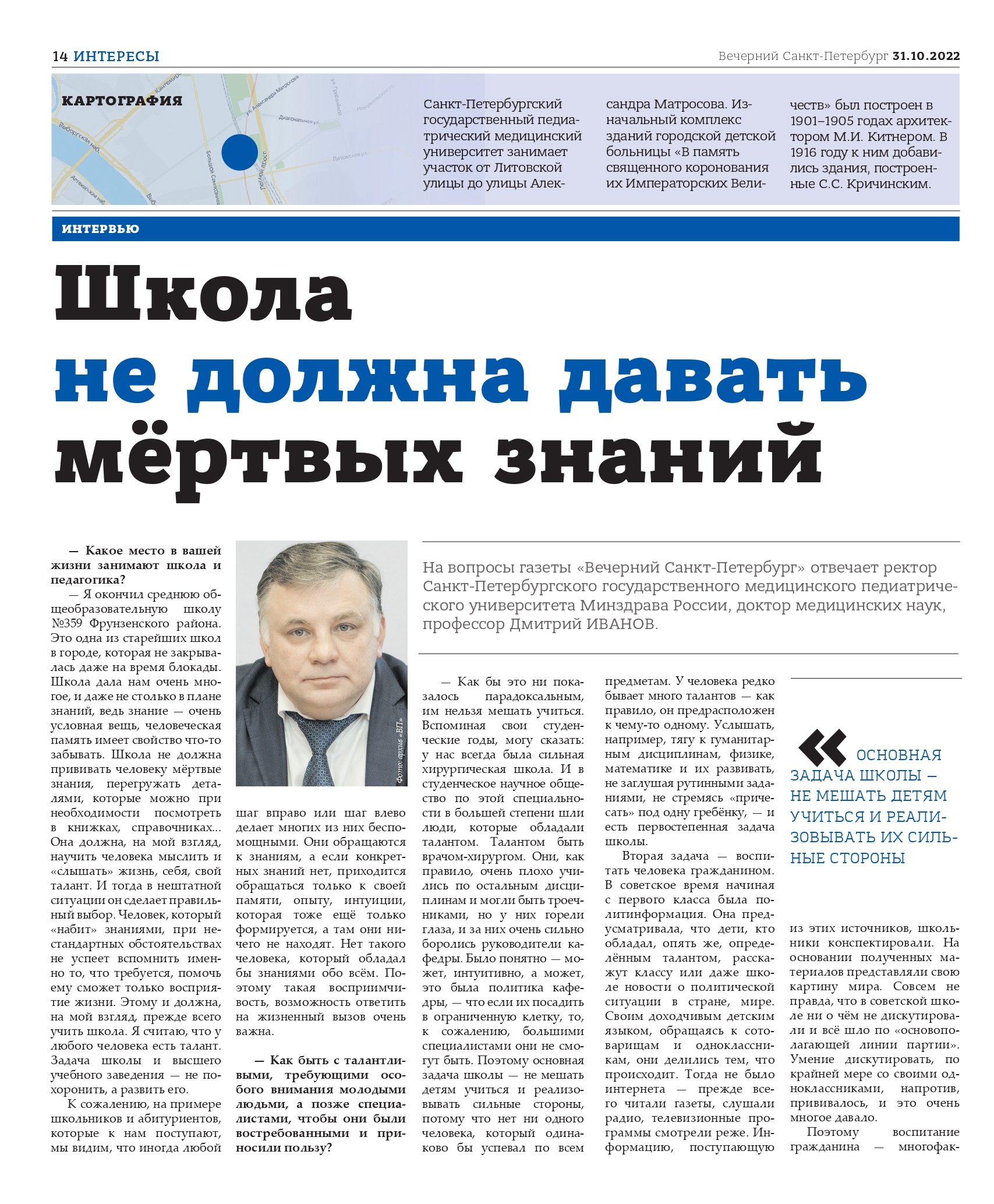 Как бы это не показалось парадоксальным, им нельзя мешать учиться. Вспоминая свои студенческие годы, могу сказать: у нас всегда была сильная хирургическая школа. И в студенческое научное общество по этой специальности в большей степени шли люди, которые обладали талантом. Талантом быть врачом-хирургом. Они, как правило, очень плохо учились по остальным дисциплинам и могли быть троечниками, но у них горели глаза, и за них очень сильно боролись руководители кафедры. Было понятно — может интуитивно, а может это была политика кафедры, что если их посадить в ограниченную клетку, то, к сожалению, большими специалистами они не смогут быть. Поэтому основная задача школы — не мешать детям учиться и реализовывать сильные стороны, потому что нет ни одного человека, который одинаково бы успевал по всем предметам. У человека редко бывает много талантов, как правило, он предрасположен к чему-то одному. Услышать, например, тягу к гуманитарным дисциплинам, физике, математике и их развивать, не заглушая рутинными заданиями, не стремясь «причесать» под одну гребенку — и есть первостепенная задача школы.