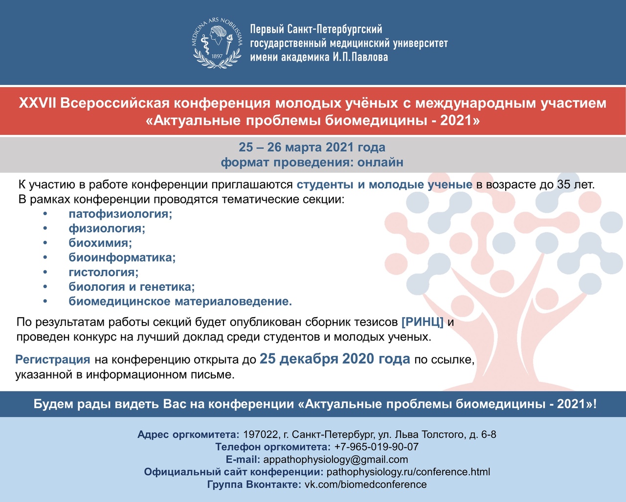 Научно-образовательный институт биомедицины ПСПбГМУ им. акад. И.П. Павлова при поддержке Санкт-Петербургского общества патофизиологов проводит 25 – 26 марта 2021 года XXVII Всероссийскую конференцию молодых учёных с международным участием «Актуальные проблемы биомедицины – 2021».