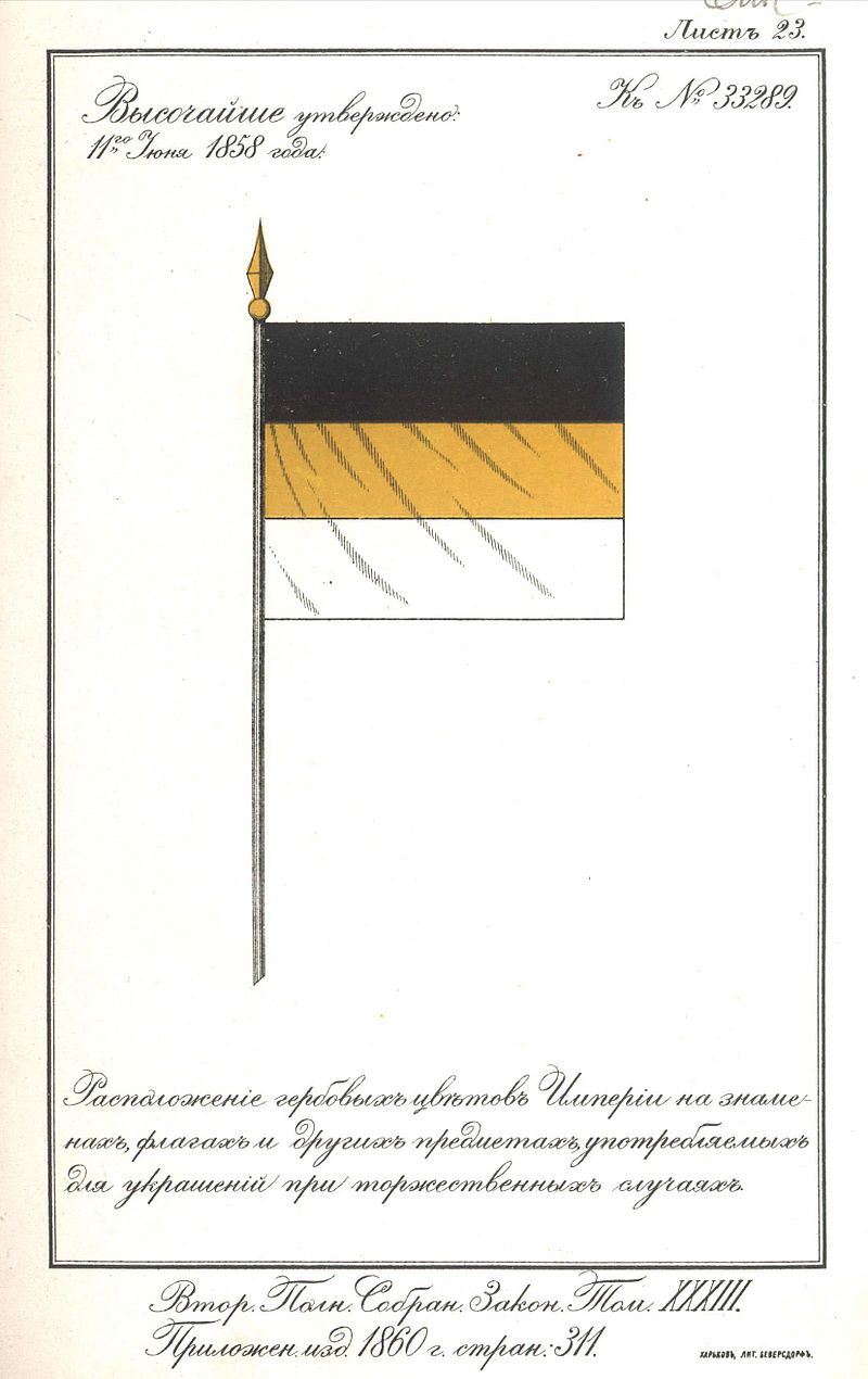 11 (23) июня 1858 года императором Александром ІІ утверждён рисунок флага «гербовых цветов Империи» (чёрно-жёлто-белый) и дано истолкование этих цветов. Указ утвердил Правительствующий Сенат Российской империи. Первоначально этот флаг получил название «гербовый народный флаг», а в 1873 году он был назван «национальным».