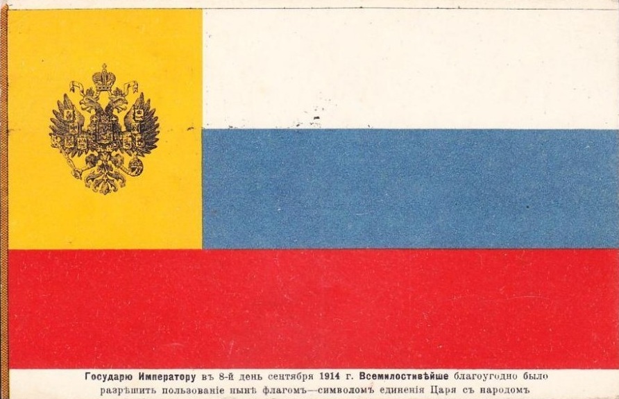 В самом начале Первой мировой войны, 12 (25) августа 1914 года, было предписано использовать на манифестациях новый флаг — бело-сине-красное полотнище с чёрным двуглавым орлом в жёлтом квадрате у древка (также разрешалось его употребление «в частном быту»). Таким образом, этот флаг соединил императорский штандарт с национальным флагом. Его символика подчёркивала «единение Царя с народом».
