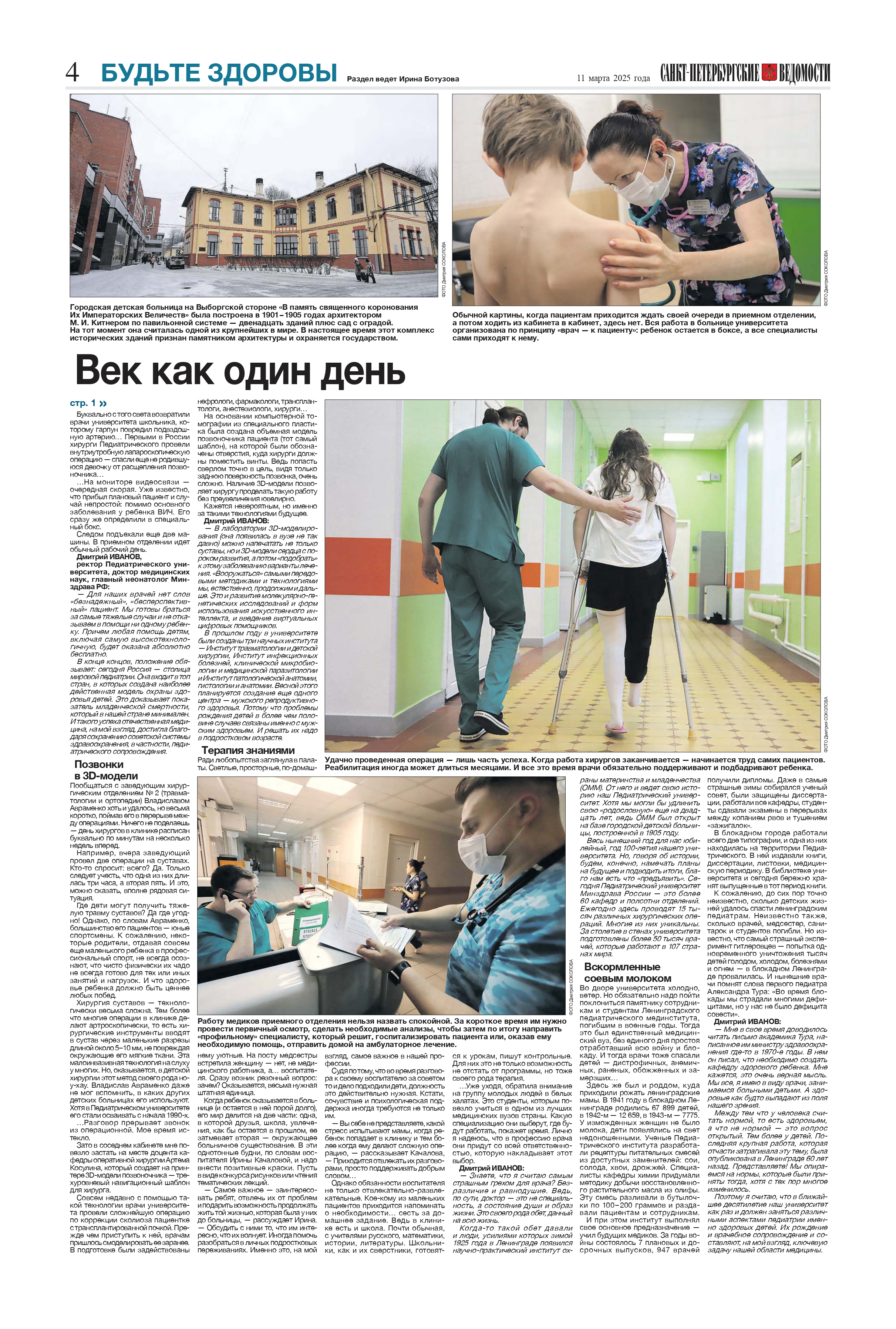 Весь нынешний год для нас юбилейный, год 100‑летия нашего университета. Но, говоря об истории, будем, конечно, намечать планы на будущее и подводить итоги, благо нам есть что «предъявить». Сегодня Педиатрический университет Минздрава России — это более 60 кафедр и полсотни отделений. Ежегодно здесь проводят 15 тысяч различных хирургических операций. Многие из них уникальны. За столетие в стенах университета подготовлены более 50 тысяч врачей, которые работают в 107 странах мира.