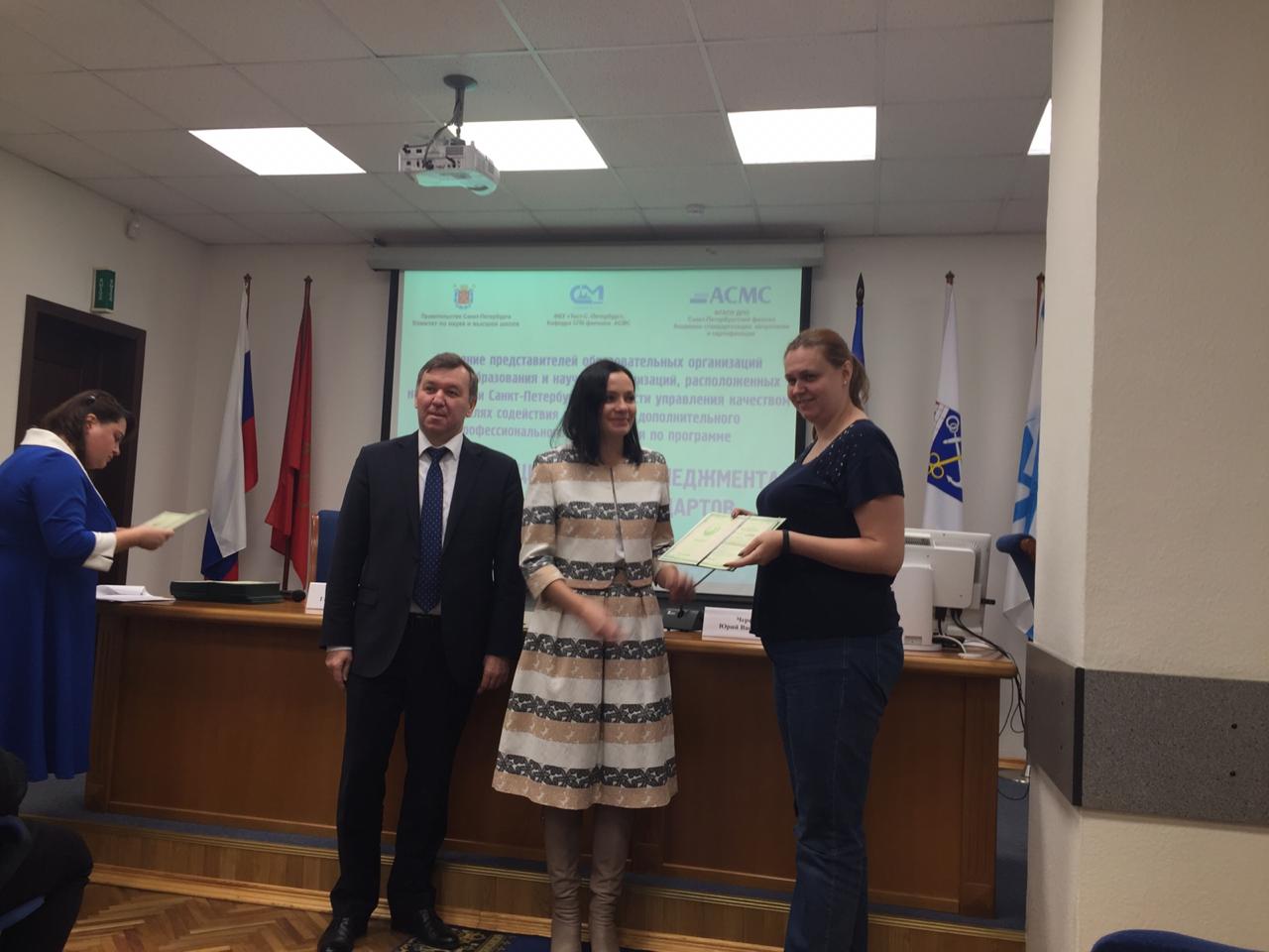 Комитетом по науке и высшей школе в соответствии с пунктом 1.7 подраздела 11.4 Государственной программы Санкт-Петербурга «Экономическое развитие и экономика знаний в Санкт-Петербурге», утвержденной постановлением Правительства Санкт-Петербурга от 23.06.2014 № 496, и решением Совета по проведению конкурсного отбора среди образовательных организаций высшего образования и научных организаций, расположенных на территории Санкт-Петербурга, в области управления качеством в целях содействия в получении дополнительного профессионального образования проводил конкурс на обучение по программе «Сертификация систем менеджмента качества на базе стандартов ИСО серии 9000».
