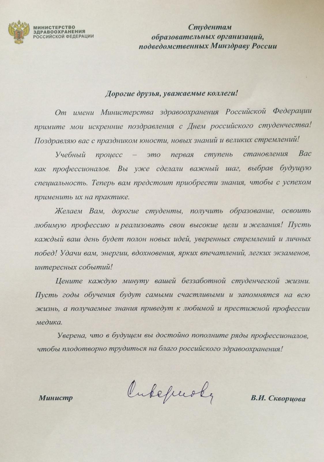 Поздравление с Днем студенчества Министра здравоохранения РФ В. И. Скворцовой