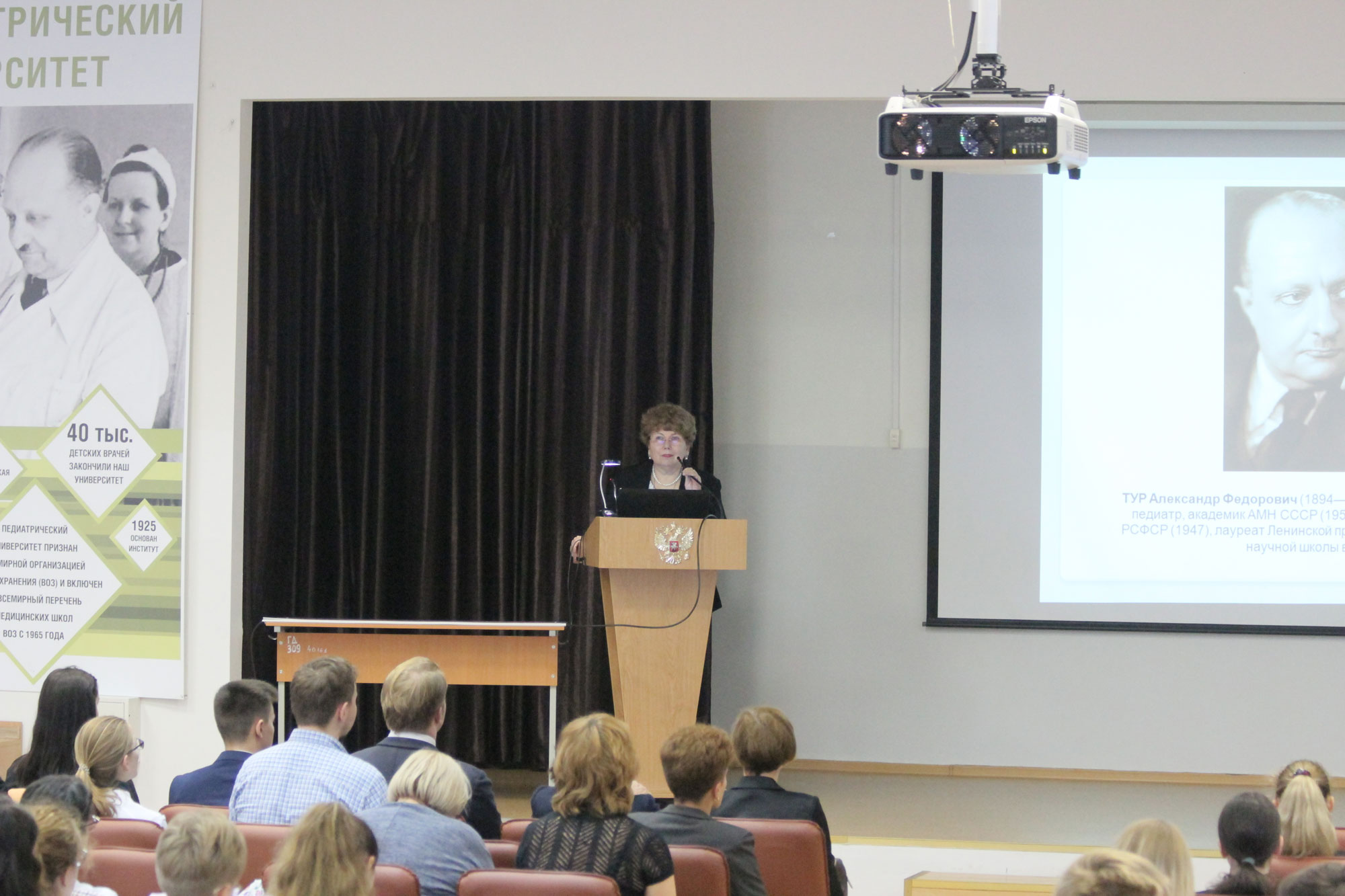 В этот день в Педиатрическом университете чествовали выдающегося советского педиатра Александра Федоровича Тура. Начался день памяти с торжественной лекции, посвященной Александру Федоровичу. Заведующая кафедрой гуманитарных дисциплин и биоэтики Галина Львовна Микиртичан рассказала о жизни и работе основоположника отечественной педиатрии.